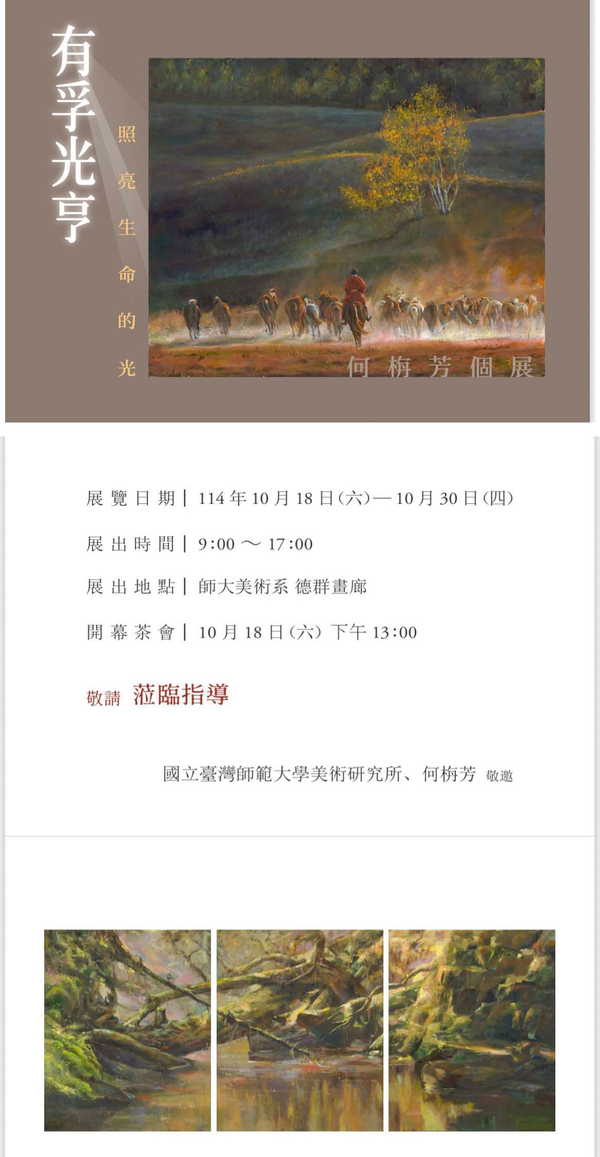 何栴芳 油畫個展 日期時間:114年10/18(周六)-10/30(周四)09:00~17:00 地點:師大美術系德群畫廊(台北市師大路1號)敬請蒞臨指導